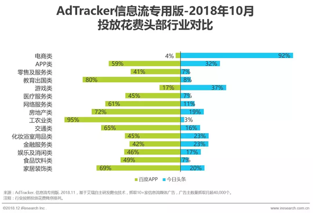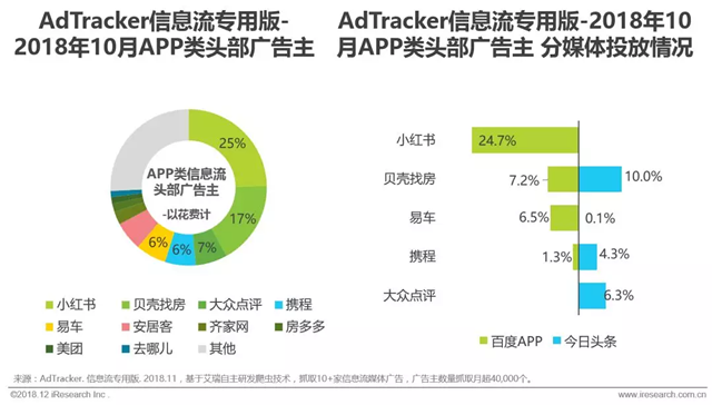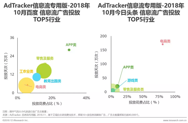 百度广告主遍布多行业,头条电商一枝独秀 百度的信息流广告主行业分布相对分散, 10月投放花费和投放天次最高的行业均为APP类,TOP5行业广告主贡献近七成投放花费;而今日头条的信息流广告主则集中于电商行业,虽然广告主数量少,但投放花费占比高达80.4%。
