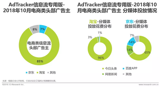信息流头部行业——电商类广告主投放情况 10月,淘宝占据整个电商行业80%以上的投放,其90%的投放集中于今日头条,因此极大地奠定了头条在电商行业的优势;而TOP2的京东的投放平台就更为分散,除了头条占据一半以上,还覆盖百度、网易等其他平台。
