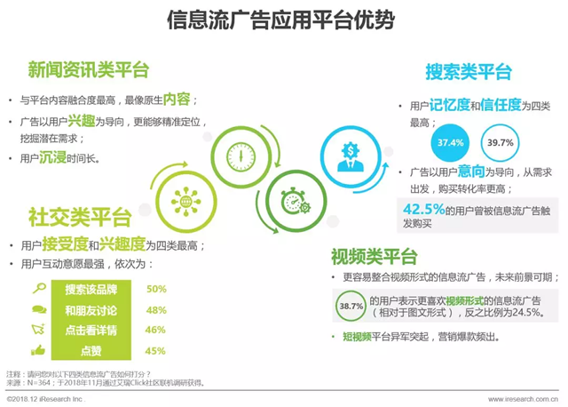 信息流广告应用平台优势 除了搜索类(如百度)和新闻资讯类(如今日头条),信息流广告在社交类和视频类平台的应用也非常广泛。 对比来看,新闻资讯类平台信息流广告的内容融合度最高,搜索类平台信息流广告以用户意向为导向,因此用户记忆度和信任度最高,社交类平台信息流广告强于用户的互动意愿,同时短视频平台异军突起,营销效果拔群。