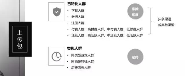 DMP作用图示 但再好的工具也会因为包含一定的局限性而导致其效果的发挥达不到预期。放量有困难、前端成本太高、后端回收不好,这三个来自DMP的固有局限直接弱化了DMP的优势功能,影响了广告投放效果。 局限产生原因 第一,人群定位模糊,人群包制作针对性不强、多性质人群包的共同使用,很可能无法命中目标用户; 第二,素材滥用问题,人群包的性质和广告素材不吻合、不匹配,无法有效引起目标用户关注; 第三,使用方法欠科学,功能使用欠科学性,忽略了对人群进行洞察分析及把控的重要性。在游戏行业中,这三点问题表现得更加突出。 那么在应对固有局限带来的问题时,只是机械的进行 效果好—放量加包,效果不好—缩量减包的拼接显然是不够的,那么以游戏行业为例,我们如何解决此类问题,真正玩转DMP? A、多模块复合运用,数据的标准化和细分 全新的DMP玩法中,今日头条通过人群管理、人群标签、主题专区、人群洞察这四大模块的复合运用,有效地对数据进行标准化和细分,提升广告主对于高价值种子用户的投放触达率,最大化地优化了活动投放的效果。 1、人群管理:精准锁定目标用户 人群管理模块主要针对人群粗糙的问题,通过上传包、规则包、运算包、拓展包、游戏包等进行高效有序的定位划分,帮助广告主精准锁定目标用户。 上传包 :在上传包中广告主将自有的各类人群数据,以设备号、手机号等形式,上传到头条DMP后台, 对此人群做定向、排除或拓展投放。