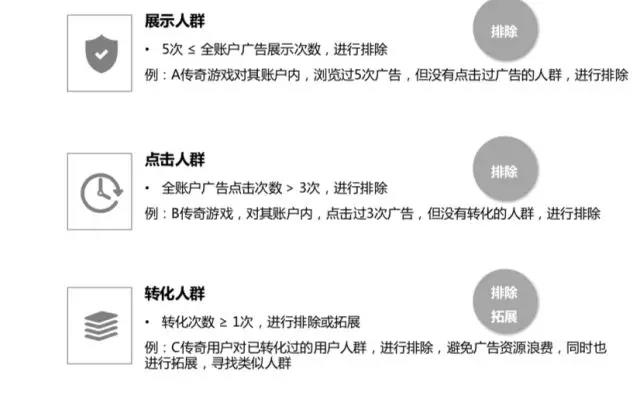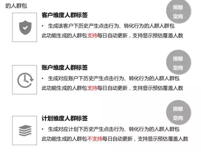 规则包 :其中含有行业数据、行业分类、产品关键词、阅读关键词四个方面的规则分类,多维度规范场景化。 在行业数据中,广告主使用头条平台投放广告后,可在同一客户ID的账户生成对该账户广告有过展示、点击或转化的人群包,客户可查看以往投放的数据,方便其根据往期数据进行二次投放。