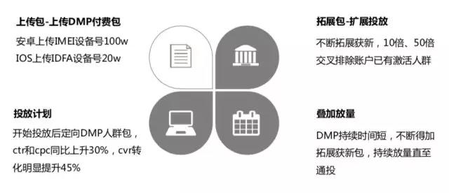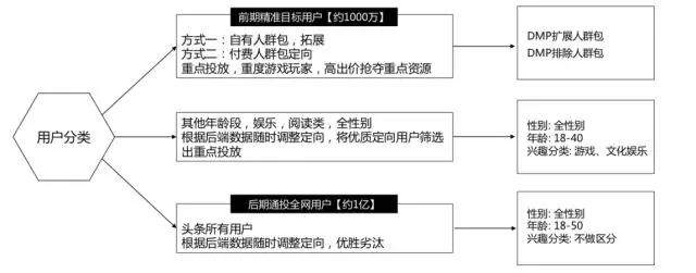 投放效果:激活数增长明显,转化成本下降50%,日均投放量相对于使用DMP之前显著提升,单日最高超过5w。通过DMP计划快速准确的建立模型,成本降低达90%。 3、某仙侠类游戏新开服 客户在需要大量曝光的同时需要精准出大目标用户,头条根据投放阶段及人群属性差异为其划分三类用户。
