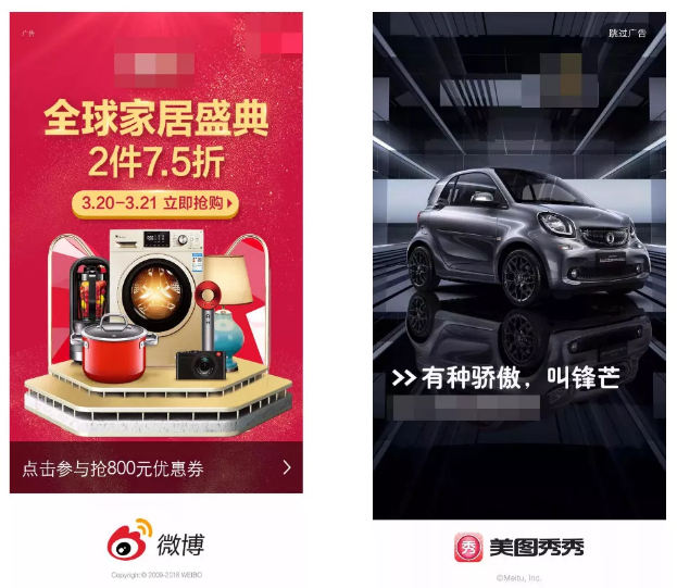 优势: 1、尺寸大,更利于抓人眼球; 2、目光较为集中,点击率相对Banner高; 投放建议: 1、广告尺寸最好等于或大于手机屏幕的一半,可设计600*600、600*500等尺寸; 2、注意与应用的协调性; 开屏广告 开屏广告出现在APP启动时,一般会全屏展示3-5秒(也可选择跳过)。通常展现形式为:图片、短视频或Flash等。