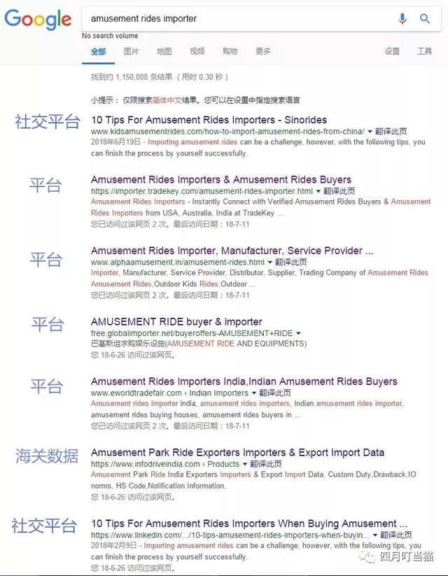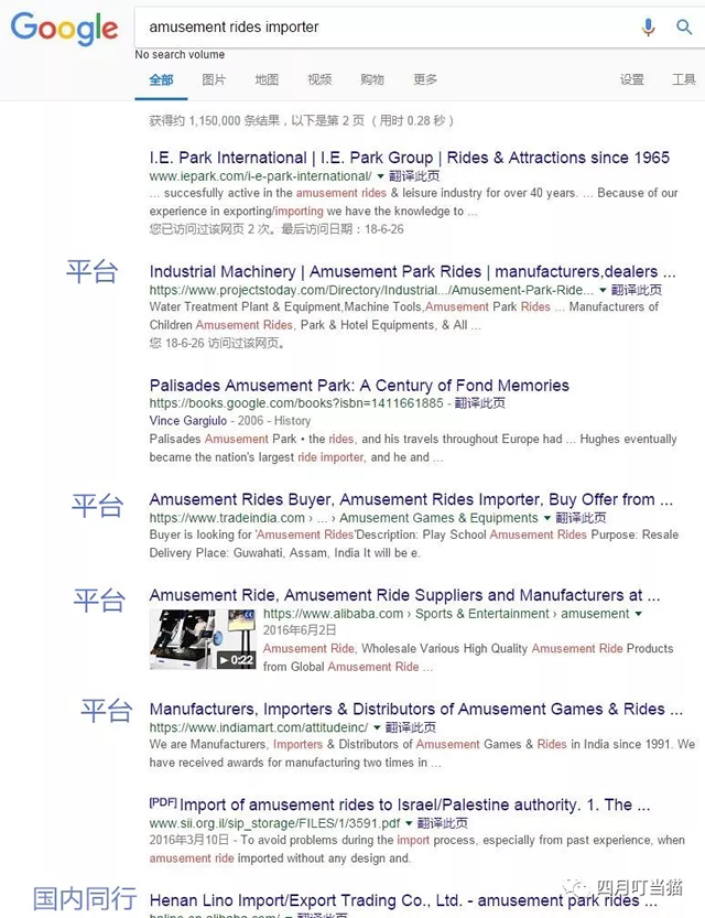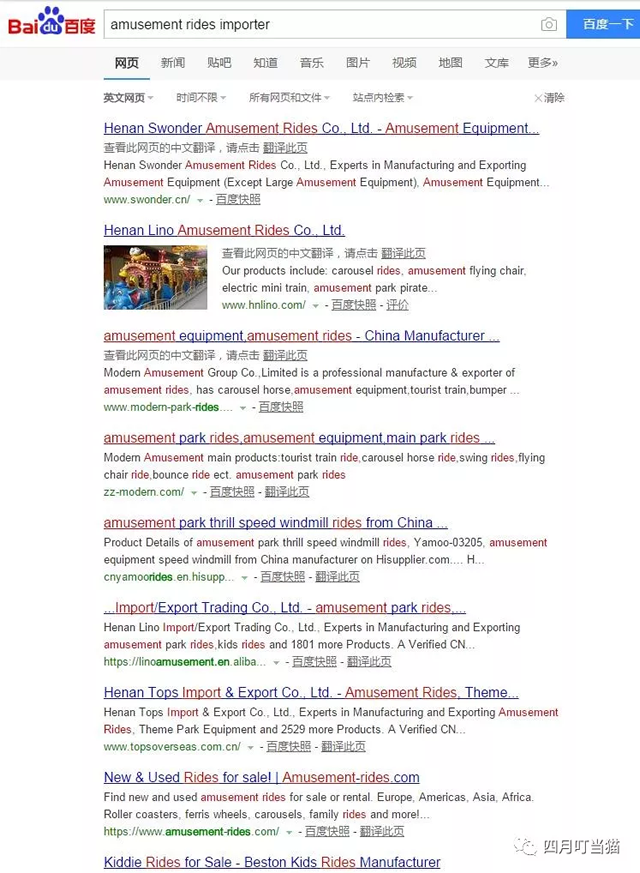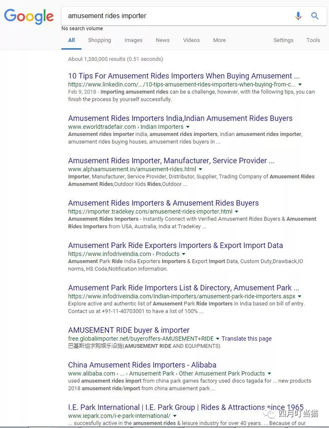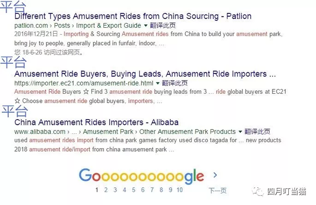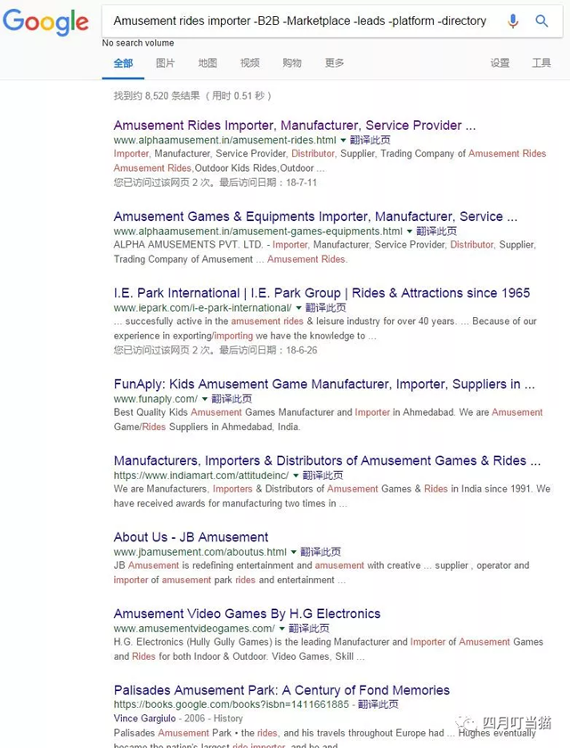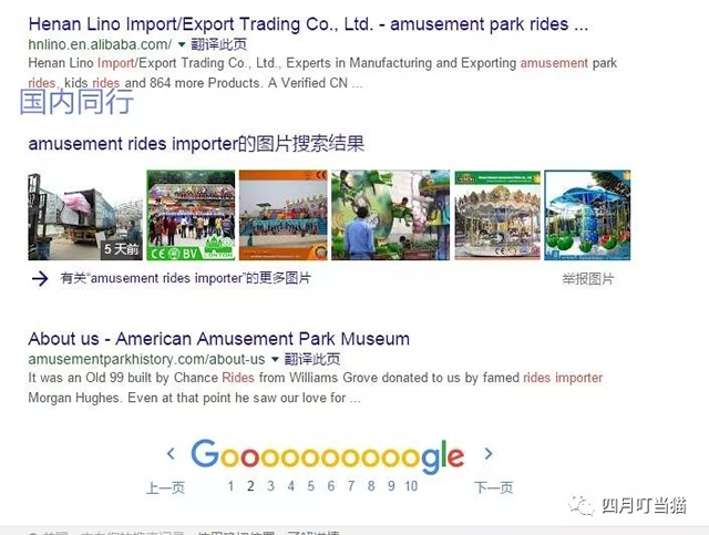 二.谷歌搜索不等于产品名称+回车键 举例说明,在不做任何限定的情况下搜索am泰一指尚usement rides importer,排在前几页的大部分是这样几类结果: