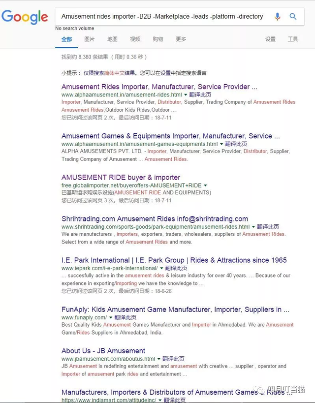 学习了更多的谷歌运算符号后,可以边搜索边改进,比如上图中第三个是没被排除掉的中文平台网站,于是设置界面语言为英文hl=en amusementrides importe” -B2B -Marketplace -leads -platform -directory -connecting-"Find Suppliers" -"Find Manufacturers" -member -buyers-China -Chinese -.cn -forum -"yellow pages" -yellowpages -online-shop -store -blog -wikipedia -youtube -.edu -.gov hl=en