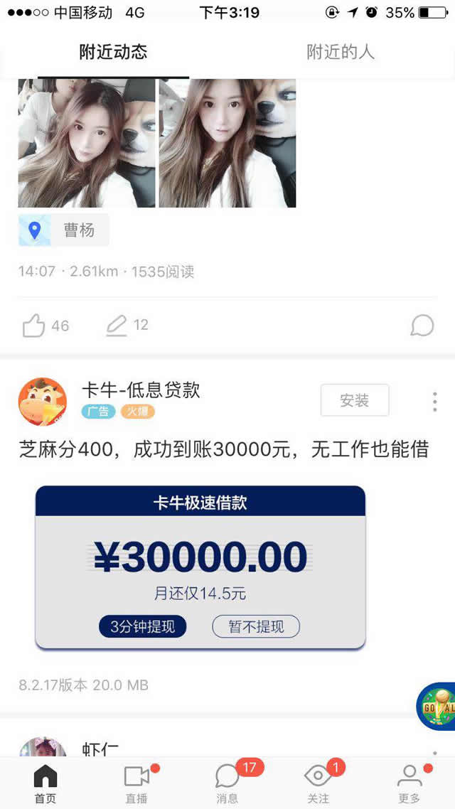 喜大普奔!!!金融贷款可以在陌陌上投放广告! 陌陌是主要针对于二三线城市的社交APP,是中国领先的LBS社交广告平台。陌陌广告可以通过LBS定性和POI能够在多场景下把广告精准投放给每一个目标受众。陌陌的广告资源有开屏广告、附近的人、附近动态。 好了,小编今天来跟大家分析分析金融贷款在陌陌投放广告是什么样纸滴~