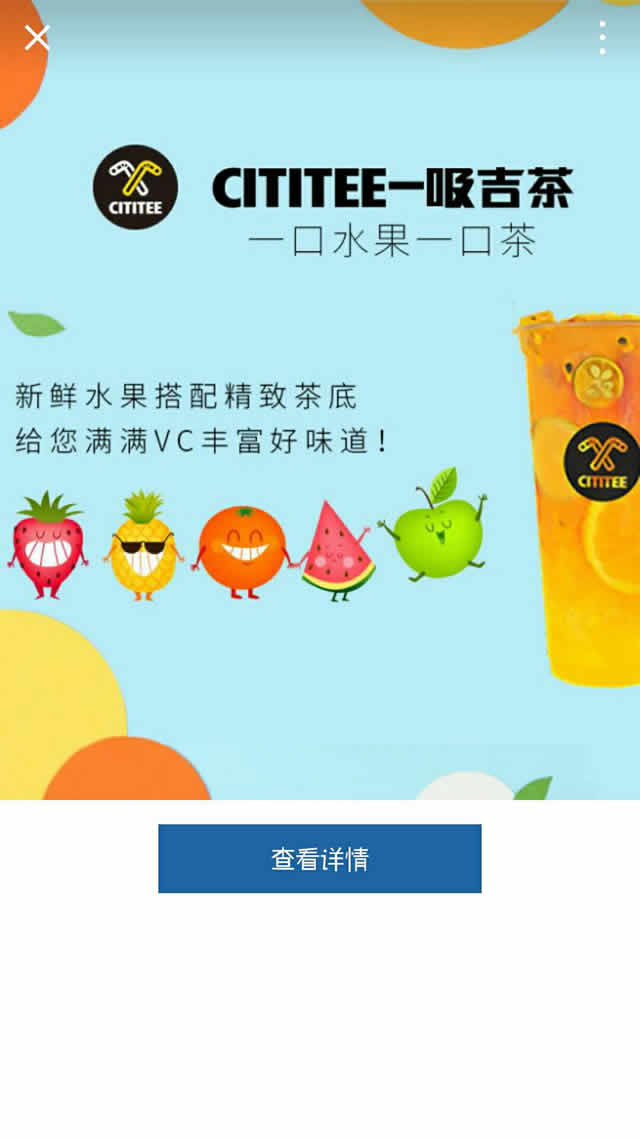 我们一起来分析下今天的微信朋友圈广告: 1.广告主是CITITEE一吸吉茶微官网 2.外层广告文案是“第二杯免费,炎炎夏日,来一杯新鲜的水果茶。” 3.外层图片,我们从外层图片就可以看出,广告是关于茶饮的广告,并且在夏天,水果和茶才是王道。 4.点击【了解更多】,会进入以下界面: