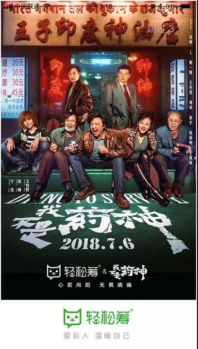 毫无疑问,《我不是药神》是近期讨论热度最大的一部电影,也是小编今年看过的国产片里最动容的一部了。电影向我们展示一个生命被讨价还价的过程:钱就是命,命就是钱!面对药物高昂的售价,病人们只能选择“用钱续命”。这些人生活在底层,没权没钱,生一场大病,就能轻易摧垮一个家庭。 这是现实的无奈与悲哀,也反映了很多中国人真实的生存困境:遇到急需治疗的大病,没有那么钱该何去何从?正是因为洞察到了当下很多人短时间之内无力筹集高昂的医药费这一社会现状,轻松筹应运而生,旗下的大病筹款平台,致力于“救急”每一位陷入困境的病友们。 此次在《我不是药神》的上映阶段,轻松筹也和电影合作宣传。借助电影带来的影响力和关注度,开启了一场多元化、全方位、互动式的公益营销新玩法。除了通过爱奇艺、腾讯视频、微信等众多渠道进行推广宣传以外,轻松筹也突破了传统公益营销教条式的沉重感,让整个过程显得轻松没有压力,从而吸引了许多年轻用户参与其中。这种具有创新精神的玩法,亦成为当下公益品牌营销中为数不多的经典案例,对整个行业来说都有典范意义。 一、借势《我不是药神》,线上线下协同发力引爆“行善” 众所周知,电影与品牌的联合在今天这个时代并不稀奇。从场景植入到赞助投资,几乎都有一套成熟的系统。然而在小编看来,如果要想真正成功,除了加强双方合作的紧密性以外,更重要的是调性上的契合。这也是轻松筹与《我不是药神》合作的重要因素:他们的理念高度一致,都是通过自身的方式去帮助患者,鼓励更多的人去行善。