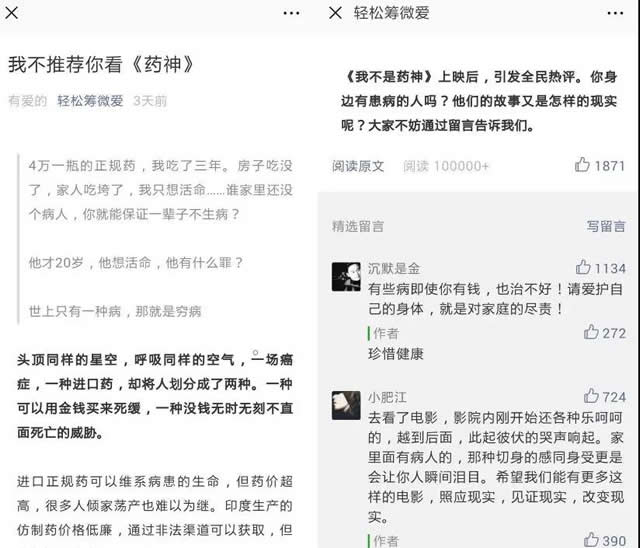 在合作的基础上,轻松筹依托于电影上映所带来的话题度,全面布局线上线下。海报、推文、APP开屏等争相上线,将品牌价值与电影宣传进行了深度的融合互动,最终实现双赢,达到1+1>2的效果。 线上:借势电影产出内容,催生UGC引二次传播 一直以来,新媒体平台都是电影宣传的重要阵地,而微信公众号/朋友圈也是轻松筹主要活跃的渠道。基于这一考虑,轻松筹在电影上映初期,尤其是口碑爆发阶段,通过旗下微信公众号发布相关推文,对电影里面的人物、剧情进行解剖,同时也将现实中病友的故事带给大家,进行内容上的融合。