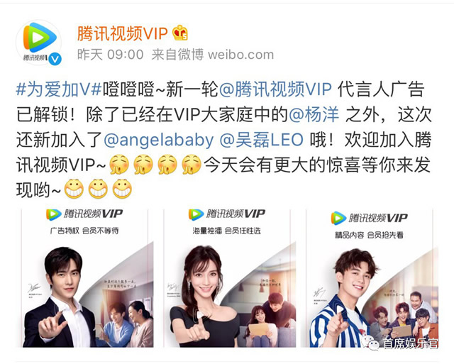 在内容之前,会员生态的建设需要更强的牵引力。去年腾讯视频VIP开启“V计划”就是一个典型案例,当时,签约杨幂、杨洋、迪丽热巴成为腾讯视频VIP会员代言人,并启动一系列满足会员多元需求、联动线上线下用户的活动,引发了业内外强烈关注。而7月16日,腾讯视频VIP官方宣布, Angelababy杨颖和吴磊成为腾讯视频VIP会员代言人。至此,五位人气偶像共同组成了腾讯视频VIP会员代言人矩阵,将再次提速腾讯视频会员增长。