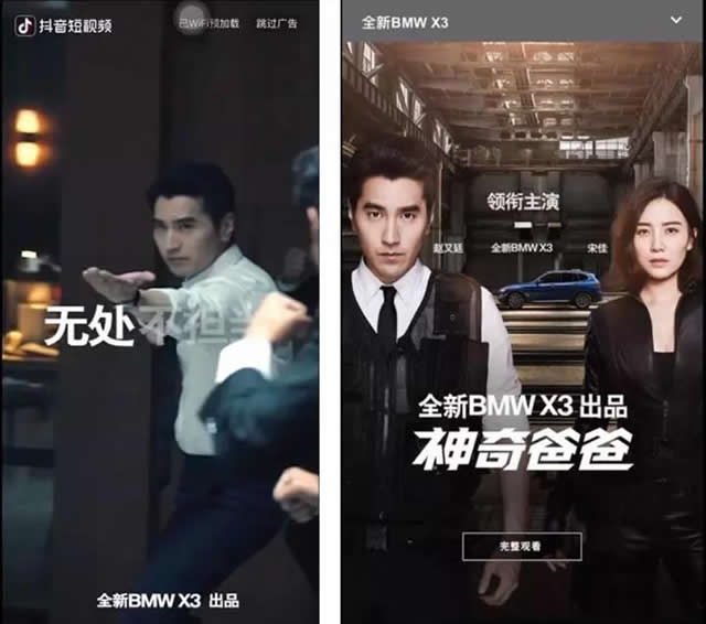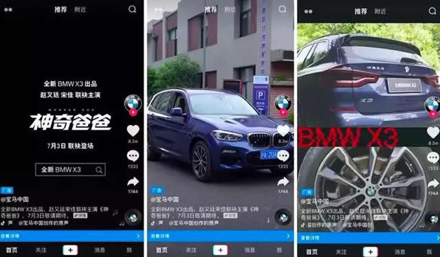 面对这些疑问,宝马全新BMW X3上市与抖音的重磅合作或许可以给到业界一些启发。6月15日,伴随全新BMW X3上市预热,由宝马出品,赵又廷、宋佳领衔出演的微电影《神奇爸爸》先导预告花絮,以抖音“开屏+信息流4-1”的广告组合打造超级BigDay,同时宝马入驻抖音品牌主页,宝马正式开启短视频营销新篇章。7月15日,宝马再度追投抖音,实现超过1.35亿的强曝光,由正片剪辑的短视频在抖音正式投放信息流,曝光达成率高达254.54%,同时收获53.5万赞。这一次“超级英雄”赵又廷驾驶BMW X3的凌厉身影现身抖音,再度为汽车品牌短视频营销之道树立业界标杆。 1、快速开启抖音二次合作,宝马看中了什么? 距离全新BMW X3抖音首秀不到一个月,宝马再次追投抖音,将赵又廷拍摄的BMW X3微电影剪辑版放到抖音做主曝光,自然与其之前在抖音首次亮相取得的惊艳效果有着密切关系。 6月,宝马全新车型X3震撼上市。为抢占声量助力新车曝光,宝马选择抖音作为投放主阵地。借助抖音“开屏+信息流4-1”超级广告组合所释放的强悍流量,以及宝马精心打造,由赵又廷、宋佳领衔出演广告片的超强人气,汽车和短视频两大行业领跑者首次跨界组合,为宝马新车上市带来了“强曝光、高互动、粉丝沉淀”三大价值收获。