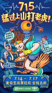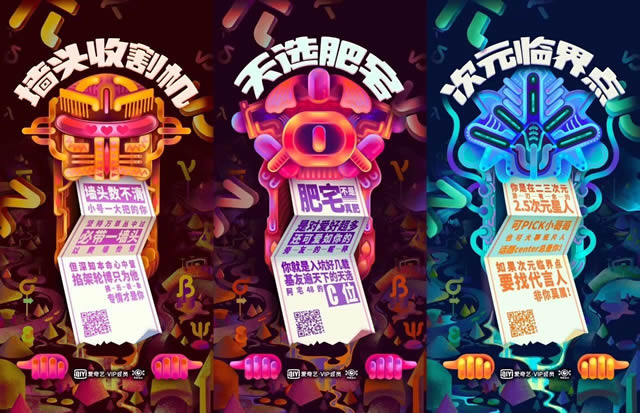 主题海报你得这么玩 随着传播节奏一同推出的,还有这些风格鲜明有趣的倒计时海报、活动亮点海报。能够吸引注意力的主题海报,有利于品牌在爆炸的信息流中抢占年轻用户的注意力。爱奇艺VIP巧妙地将品牌信息植入海报内容中,使品牌本身成为了一种实体化的表达,同时制造了一定的品牌声量。