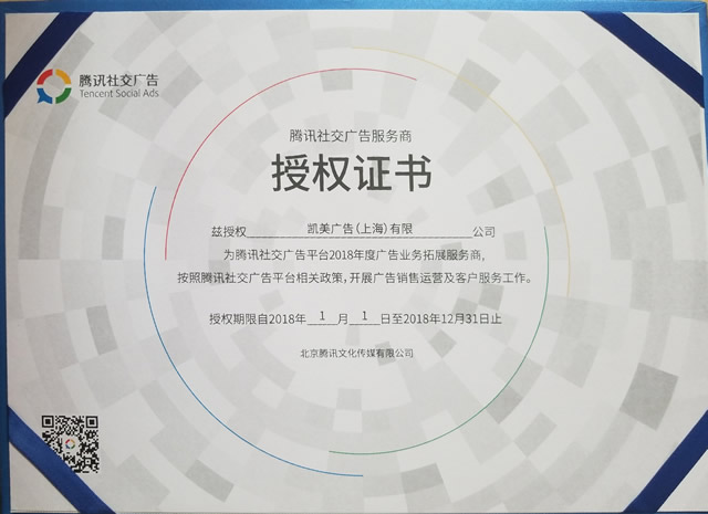 上图就是小编在QQ空间发现的微动信息流广告,点击广告,广告素材就会发生变化。 QQ空间视频广告和微动广告都可以通过腾讯广点通来投放广告,我们上海是腾讯社交广告核心代理商,你想要投放QQ空间视频广告和微动广告就可以跟我们取得联系,我们会为你提供全网营销的推广方案,拨打免费热线:即可进行免费咨询。 以下为区域核心授权代理商授权证书,如果广告主有所怀疑,也可拨打腾讯官方电话,进行查询。