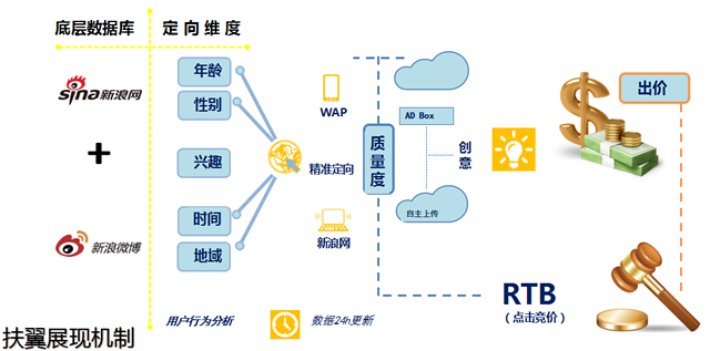3、新浪扶翼 新浪扶翼有超过40亿的页面浏览量,招商加盟的广告主投放新浪扶翼广告,可以自行锁定目标受众,具有大量曝光,并且新浪扶翼上的广告投放时间较长,也可以根据用户的历史浏览行为记录对目标受众进行精准定向。新浪扶翼的主要目标受众是在20-40岁之间,男女比例为6:4,其中80%的用户都是大学以上,并且他们也具有一定的高消费能力。新浪扶翼的广告计费方式也可以真正的实现预算可控。新浪扶翼的广告资源包括950*90px通栏广告、250*230px广告、240*170px按钮广告、画中画广告以及文字链广告,这些广告都可实现多维度的定向设置,也能够把广告建准投放给目标受众。