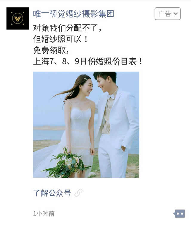 看到广告,我们可以了解到以下信息: 1、广告主是“唯一视觉婚纱摄影集团”,难道只有我一个人感觉超霸气的么? 2、广告文案为“对象我们分配不了,但婚纱照可以!免费领取,上海7、8、9月份婚照价目表”。对于母胎单身的人来说,分配对象重要一点。但是对于有对象并打算结婚的人而言,肯定是婚纱照重要一点咯~ 3、图片~图片应该是该公司拍摄的精美样片之一,想看更多的精美样片?赶紧关注微信公众号咯! 看到这么精美的拍摄样品,点击图片说不定可以看到更多!!