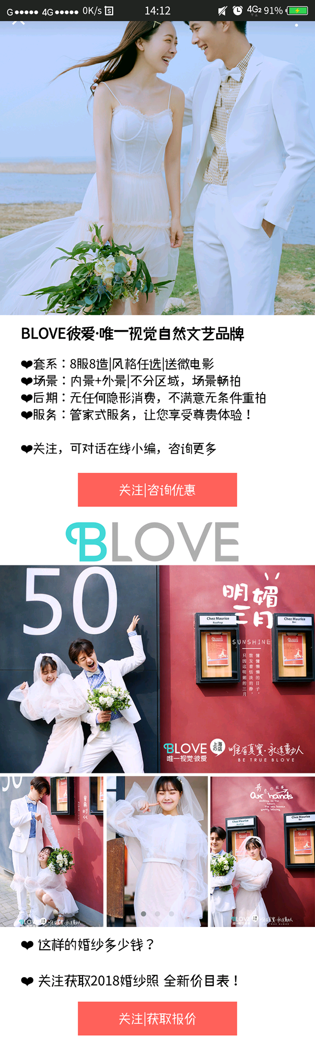图片都辣么美,进入的落地页也是不同寻常的。我们可以看到这个落地页的内容还是挺吸引人的,“8服8造,送微电影,场景畅拍,无隐形消费”这对于新人来说,是具有一定的诱惑力,我们在来看看下半部分,是别人的婚礼拍摄样片,落地页在这里有给新人留个悬念,那就是如果你也想拍这样的婚纱照需要多少钱?以及获取2018年婚纱照价目表。 广告主的推广目的是吸引用户关注,所以无论我们是点击【关注|咨询优惠】还是点击【关注|获取报价】进入的页面都是公众号的关注页面。