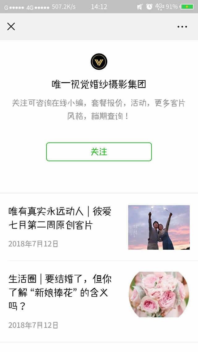 4、以往,在图片下方会显示店铺地址,或是【了解详情】,而这次则是【了解公众号】,用户点击蓝字【了解公众号】会进入微信公众号关注页面,用户点击关注即可。 最后,小编替大家总结下: 婚纱摄影行业的广告主如果要投放微信朋友圈广告,首先要明确自己的推广目标是要收集客资还是要推广企业的微信公众号。如果是要收集客资,广告图片就可以直接链接到落地页,落地页上可以精美的拍摄样片和表单,表单上可以收集客户姓名、联系方式等等,如果是要推广自己企业的微信公众号,也可以直接链接到公众号关注页面。如果有别的推广目标,也可以根据推广目标的不同来设计不同的落地页。 关注微信公众号确实是很好的推广方法,但是企业在有了大量粉丝基础以后,还需要保证能够给用户提供大量有用、用户喜欢的信息,只有这样才能保证用户的留存!