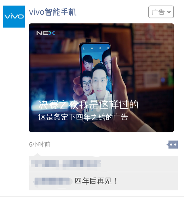 华帝这一波可以说是很强势了。 世界杯期间,各大品牌营销海报,营销案例,各大微信公众号,品牌都玩坏了,小编也给大家分享关于VIVO在微信朋友圈广告投放的一支关于世界杯决赛之夜的广告,虽然不及华帝,相对于同行手机行业的品牌主而言,VIVO投放的广告也还是很优秀的! 我们先来看看广告在朋友圈的存在是怎样的?