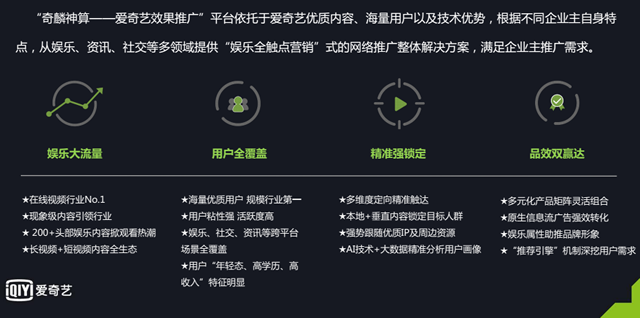 约瑟夫﹒朱兰的理论曾经说过,“80%的利润来自20%的优质顾客,”指向的这群人就是精英阶层,据联合国经合组织不完全统计,该人群在中国超过3亿,相当于整个美国的人口,他们集中在北上广深一线城市和经济迅速崛起的二线城市。对于品牌危机公关的地点选择主来说,这是最有价值的用户群,各大品牌无不费尽心思琢磨“How to find them”? 针对精英人群,常见的投放方式不外乎两种。从内容上,购买精英人群可能关注的财经、时尚媒体广告,或从空间上,购买楼宇类广告。但它们都存在精准度和效果不可控的问题。 随着大数据技术的发展,互联网带来了锁定精英人群新思路。显而易见,每个人的居住场所和工作场所等高频出入地点最能直观反映个体消费能力,而随身携带的手机设备可谓记录地理数据信息的不二之选。 而爱奇艺正是基于这种思路,依靠百度地图、百度导航、百度搜索等百度系APP矩阵提供的海量搜索数据,分析出用户的住宅地址和工作地址,并删选出高端精英人群集中的高端住宅和写字楼,整合成精英人群数据包。当这些精英人群来到爱奇艺就会看到只针对他们投放的广告片。爱奇艺具有精准投放、海量触达的独特优势!