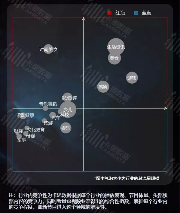 头部节目马太效应示意图 面对高潜能市场,如何才能收割更多的人口红利?某种玩法爆红后,怎样才能复制成功不被落下?机遇、挑战、趋势、蓝海... 如何才能保持战略的领先性? 市场的变化通常呈出快速且复杂的状态,打造一款现象级的内容产品往往天时地利人和一样都不能少。不断根据ROI(投资回报率)来优化内容模式则是最明智的做法,毕竟不在乎盈利的团队还是少数。 用迭代及跨界来调整内容产品的赛道,始终通过保持自身的独特性来减少发展阻力。卡思数据经常提到的红蓝海示意图就是将各个行业的内部竞争力做出区分,为创作者提供更多有关赛道的参考信息。