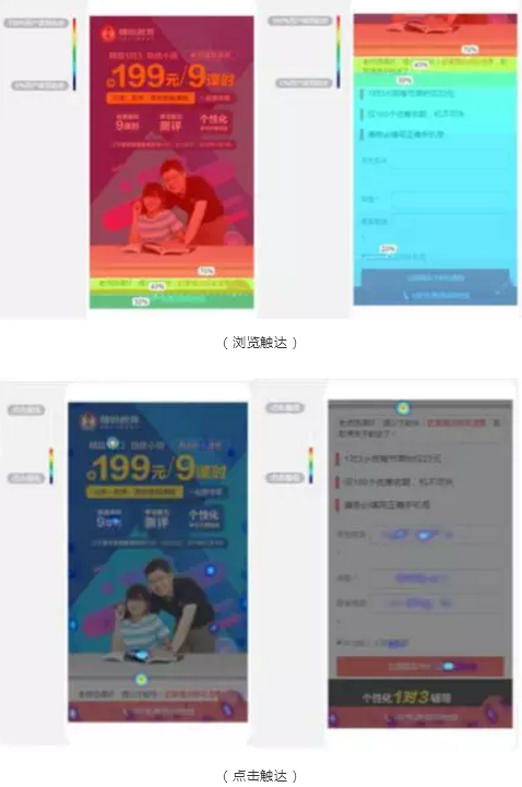 优化后落地页将课程价格利益点、课程内容、课程针对人群等重要内容全部提前,并在表单前增加引导语,强调每节课时的价格,比199元/9课时更加直观,增加100个名额限定词,并马上接上表单,调动受众急迫感与紧张感,提升转化。 2、优化后落地页热力图分析