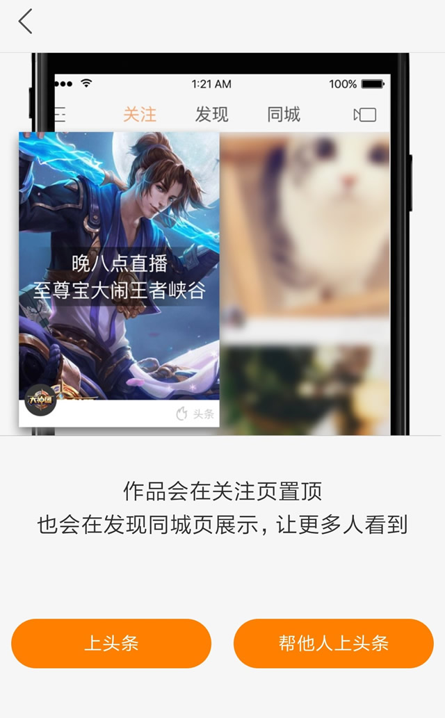 (4)多刷快手的发现页,了解近期快手的热门内容、音乐等。根据自己的内容调性来模仿、创作相关的视频内容。 内容推广工具 除了内容、运营方面的技巧外,如果想获得更多的曝光机会,创作者可以通过快手官方推出的付费推广服务——粉丝头条,来加大作品在快手的曝光量。