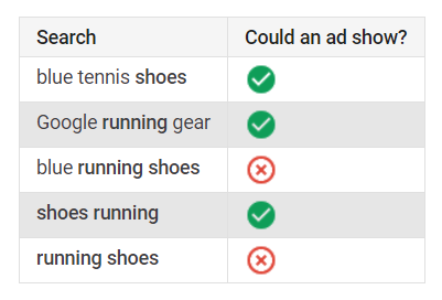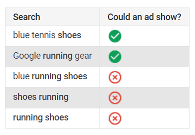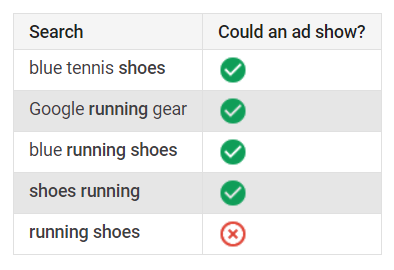 2、词组匹配 对于词组匹配关键字,如果搜索包含相同顺序的确切关键字词条,则您的广告将不会展示。 例:词组匹配——running shoes (搜索以下关键词 | 广告能否被展示)