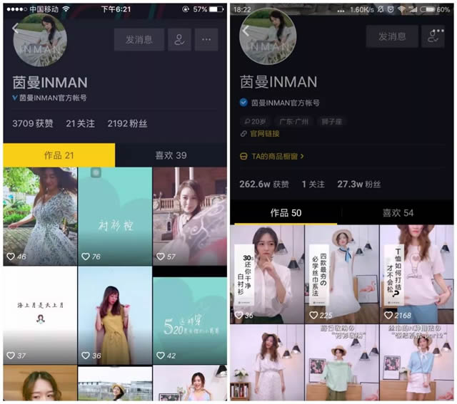 同时,七大博物馆也用自己的抖音账号发布了#嗯~奇妙博物馆#的挑战视频,最终挑战有超过5万人参与,各个博物馆的账号也因此大幅涨粉。 3、建立品牌人设 建立品牌人设的目的是以品牌人格化来聚集用户群体和增加粉丝粘性。在抖音上,这个品牌建设的方法依然适用。所以,想要打造一个有吸粉能力的蓝V账号,就要考虑为账号打造专属人设,走固定风格路线。 茵曼作为一个服饰品牌,本身已经形成轻奢、小资的唯美风格。但问题是,这种风格在抖音很难传播,抖音用户似乎更喜欢潮、酷的风格,而不是唯美的风格。 不过,茵曼的唯美风格在抖音上的运营却很成功。从5月中旬开始运营,截止7月27日,获得了282.5万点赞和29.9万粉丝,其中一个爆款视频达到了132.1万点赞和11.7万的转发。