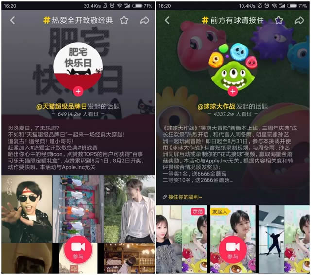 金科文化总结出一套品牌抖音账号运营逻辑:首先,通过对品牌客户需求的了解,设置账号定位,确定账号人设及内容主线;然后,通过制作优质的视频内容,聚焦目标用户,提升用户粘性;最后,通过品牌账号优质内容的沉淀影响,持续吸引目标用户,从而搭建抖音自有的粉丝流量池。 4、开展抖音挑战赛 “挑战”类活动是抖音为企业提供的独特营销模式,这种方式号召抖友们以一首歌或其它形式参与短视频的比赛,从而传播品牌,获得消费者好感。 抖音每天都会更新不同主题的挑战,将时下热点和短视频相结合,不仅能够激发用户的创作热情,也更容易借热点进行内容传播。 其次,活动入口也相对比较浅,用户可以在推荐的视频中点击话题按钮直接跳转到活动页面,也可以通过“发现”中的热搜内容进入活动页面。