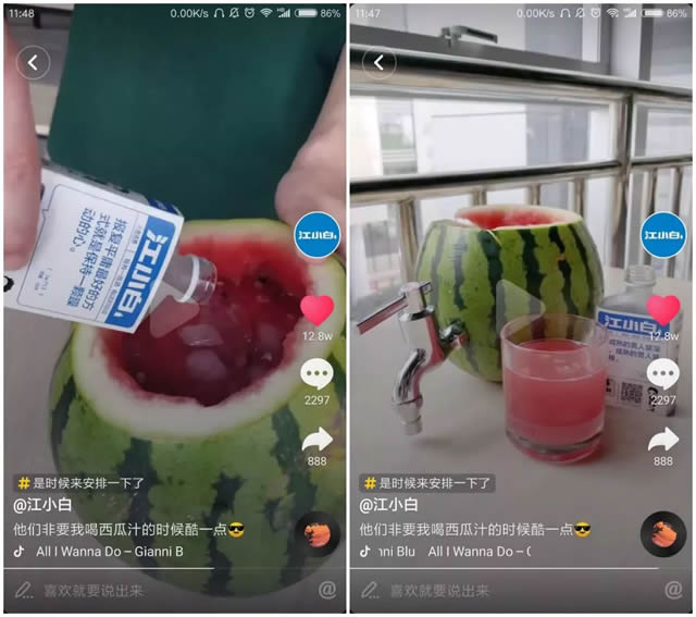 据了解,有两个企业发起的挑战赛进入了抖音热搜,分别是由天猫超级品牌日发起的“热爱全开致敬经典”,有64914.2万人看过,球球大作战发起的“前方有球请接住”,有4337.2万人看过。 从这两个案例来看,挑战赛能否火起来,主要看两点:一是内容足够好玩,使用户印象深刻;二是低门槛,用户容易模仿,传播造成的裂变效应明显。 5、植入创意广告 硬广最大的问题在于内容不够有趣,在视频中植入创意广告既能保证用户看了不反感,也可以做到广告即内容的效果,让广告本身降低违和感,但这对内容制作者的脑洞要求较大。 比如,江小白的一个视频是“他们非要我喝西瓜汁的时候酷一点”,把西瓜本身作为容器,把果肉捣碎变成果汁,加入冰块和江小白,插上水龙头。 这条贴近用户生活场景的广告获得了12.8万的点赞和2200多的评论。