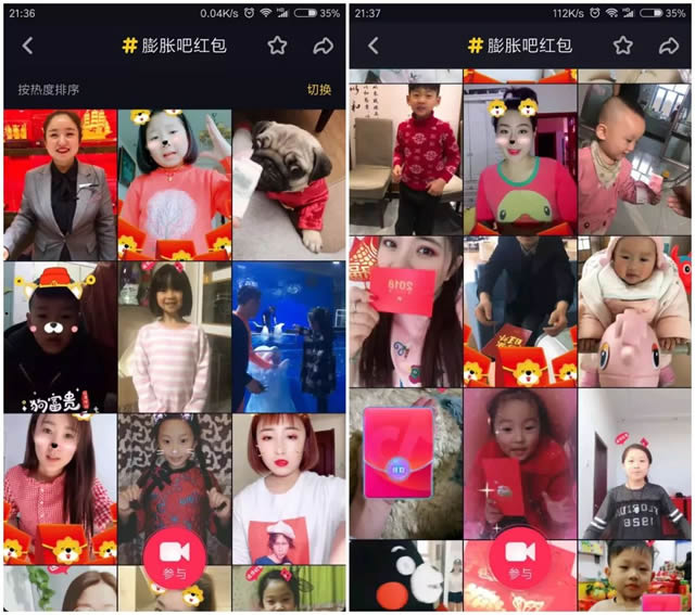 7、制作互动贴纸 抖音上可以实现为商家进行创意贴纸定制,用户在拍摄视频时,可在贴纸栏下载品牌定制的抖音贴纸,其中包括2D脸部挂件贴纸、2D前景贴纸等。这种方式最大的优点是让用户主动参与其中。目前效果最好的是苏宁的膨胀红包,当时正好是春节,大家都会发红包,使得这款贴纸在非常短的时间内被15万人使用。