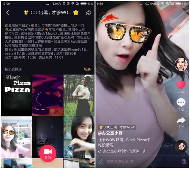 另一个是必胜客的案例。必胜客曾策划#DOU出黑,才够WOW#的主题活动,用户在参与挑战视频制作时,可随意运用含有必胜客元素贴纸,丰富视频内容。