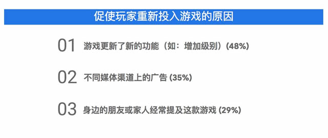 4.流失的玩家会因为什么回来?我们发现,对游戏失去兴趣是最主要删除游戏的原因,这主要包括游戏不常更新或打通关等。我们可以通过提供新功能、做广告、熟人推荐召回等方法来找回他们。