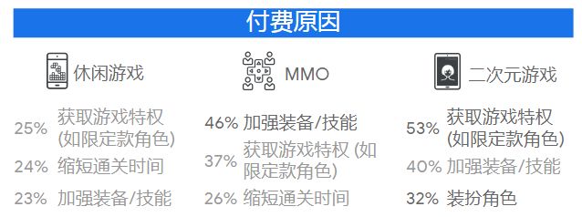 尽管MMO玩家和二次元游戏玩家付费意愿较高,但他们的付费动机是不尽相同。