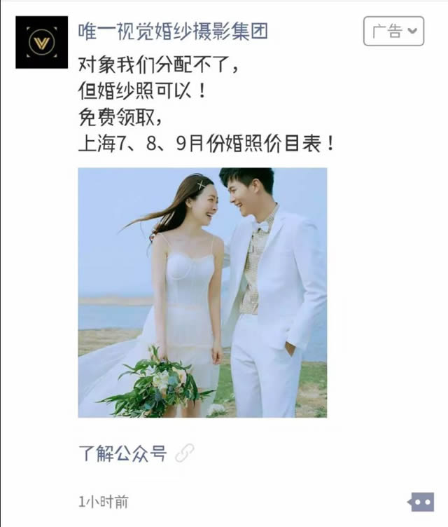 对热搜词进行分析,可以看出,每日热搜词有婚纱照、婚纱摄影、巴黎婚纱摄影、韩式婚纱照、薇薇新娘、三亚婚纱摄影、金夫人等。广告主们在投放的时候也可以以此为切入点,进行素材的设计。 素材设计案例 或许你已经看过很多婚纱摄影行业的朋友圈广告,大多数的广告文案都是近期活动、优惠券或是套餐,今天小编来给大家分享个不一样的。这一个婚纱摄影广告主别出心裁超大力度活动,上来直接送婚纱照!