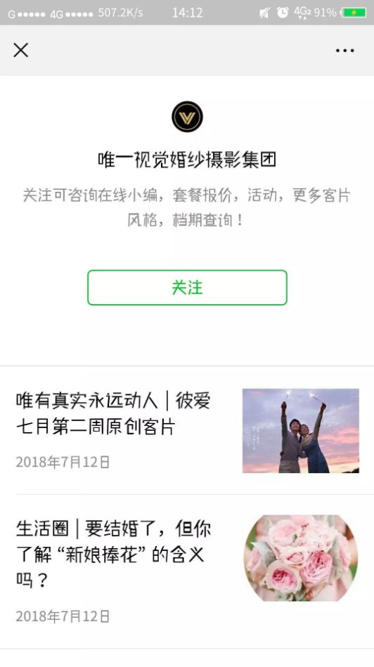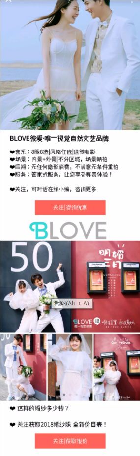除了新人们的婚礼拍摄样片,文案还制造了悬念:“如果你也想拍这样的婚纱照需要多少钱?”“关注即可获取2018年婚纱照价目表哦!”从而吸引用户关注。点击【关注|咨询优惠】和点击【关注|获取报价】,都会进入公众号的关注页面,增强用户关注的几率。