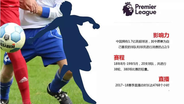 英超X爱奇艺 联合英超中国版权商新英体育共同推广英超赛事,共享市场、商广资源创造“1+1>2”的营销模式。 1.中国观众消费潜力巨大:中国拥有1.7亿英超球迷,其中愿意为自己喜欢的球队和球员进行消费的占2/3; 2.爱奇艺独掌380场全场次直播,覆盖所有官方集锦;20支球队,共进行38轮、380场比赛的较量。2017~18赛季直播总时长达4768个小时。让球迷“一个平台上就可以看到全部比赛”的愿望得以实现。