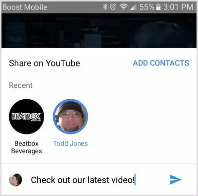 接下来,选择要将视频发送到的联系人,然后输入消息。您可以通过点击一次与一个或多个联系人分享视频。