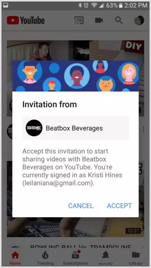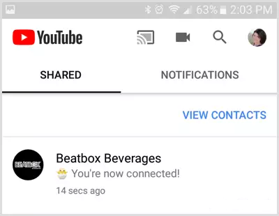 当用户点击“接受”以选择加入你的YouTube联系人时,他们会收到确认信息,表明他们已在屏幕底部接受了邀请。