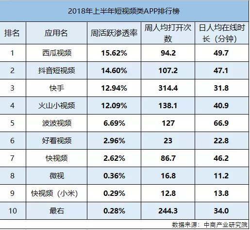 最新出炉的《2018年上半年短视频类APP排行榜》中,西瓜视频(含今日头条西瓜视频)以49.7分钟的日人均在线时长,94.2次的周人均打开次数,高达15.62%的周活跃渗透率拿下冠军,抖音和快手以及“字节跳动”的另一款短视频APP火山小视频分列二到四位。
