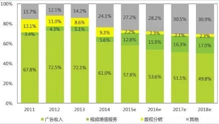 对于广告主而言提升广告品质,刺激用户完成观看就成了投放前必须要完成的科目。良性循环后youtube的广告质量逐年趋近于大片水准。 这是因为YouTube虽然面向的是全世界用户,却按欧美人的广告逻辑进行了代入,广告注重效果,直来直往的互动,有别于传统电视广告。 Youku首创的模式则是付费用户免除广告。并且随着90后消费市场的形成,付费观看的用户习惯逐渐培养起来。2018年阿里的财报更是提到优酷会员涨幅高达160%。从下图视频网站2011-2018的收入占比发展趋势来看,会员付费的爆发从14年开始,已经进入稳定发展的阶段。