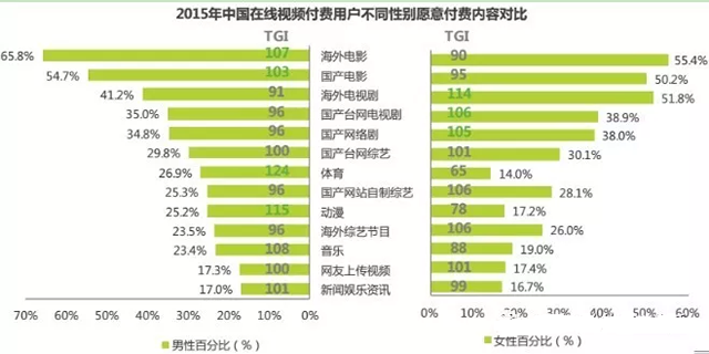 而从下图付费用户愿意付费的内容占比,可以看到,排名靠前的均是长视频类节目。中国用户对于付费的内容仍停留在版权内容上。对于我本人来说,花钱买一个1个半小时的好莱坞大片,就算最后评分是4分我也觉得是个好莱坞烂片。而花钱买个7分的网友上传的15分钟视频,就要多考虑考虑了。