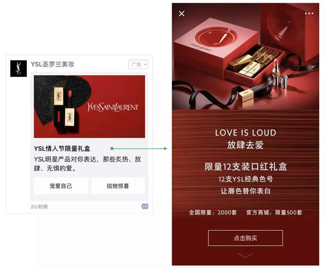 基于此,微信广告借助腾讯社交大数据,并结合第三方机构调研数据,首次推出《成就好营销——2018微信广告美妆行业洞察及产品解决方案》,希望能助力美妆品牌做好社交营销,共同把握市场机遇。 趋势一:社交媒体成为美妆营销主阵地 90%+美妆品牌声量来自社交媒体 美妆品牌越来越重视社交声量以及借助社交传播提升品牌。据统计,近一个月美妆品牌相关网络声量超过90%都来自于社交媒体(数据来源:腾讯指数,此数据主要关注头部美妆品牌)。同时数据显示,社交传播能有效提升品牌对消费者的影响效果。因此,如何让品牌成为社交活跃者,成为美妆品牌的首要课题。 1、策略建议 1.善用社交能力,借助微信社交基因和关系链数据能力,提升社交互动。 2.配合重要节日、新品发布等节点投放,放大品牌声量。 2、YSL圣罗兰美妆 社交场景节日营销,激发消费需求 YSL在情人节投放了朋友圈选择式卡片广告,新颖形式和创意充满社交话题性,引发用户积极互动,评论率高于行业均值200%, 5000多个礼盒2小时内抢购一空。 YSL圣罗兰美妆朋友圈广告示意