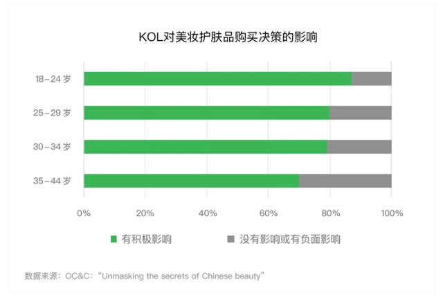 趋势三:KOL带货效应凸显 80%+年轻用户美妆购买决策受KOL影响 调研显示,明星和美妆达人的推荐对美妆人群的购买决策有显著的积极影响,而且越年轻的消费者越容易受KOL影响。粉丝经济的威力已经让品牌尝到甜头,美妆公众号的带货能力也不可小觑。 KOL对各年龄段美妆用户购买决策均有较积极的影响