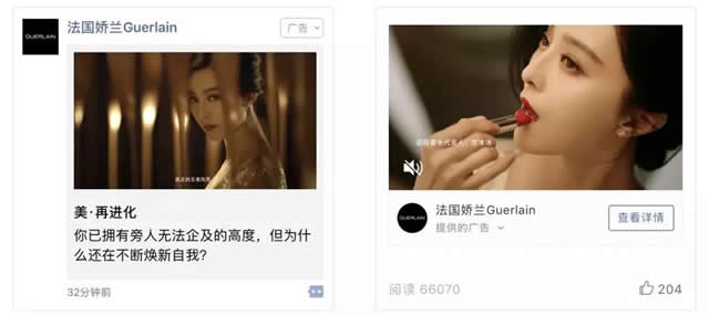 1、策略建议 1.精准数据定向明星粉丝人群,提升品牌声量和广告互动率。 2.投放公众号互选广告,借垂直KOL原创内容影响力种草,提升转化率。 2、法国娇兰Guerlain 组合投放推新品,KOL实力种草 娇兰为范冰冰代言的新品口红同时投放了朋友圈卡片广告和公众号互选广告,借助KOL影响力提升品牌声量,带货效果显著,官网销售同比翻倍。 法国娇兰朋友圈广告&公众号互选广告示意