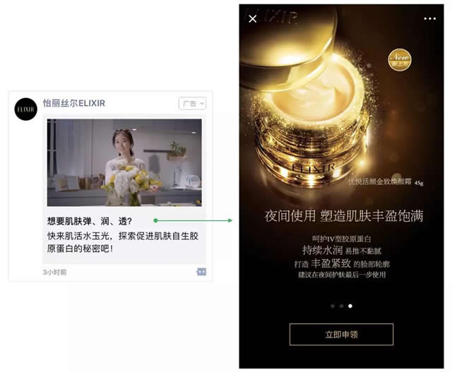 趋势四:线上线下全渠道整合运营 线上消费引领全渠道增长 线上渠道的发展正在改变美妆行业零售模式,2017年,中国护肤品线上消费增长率41.9%,彩妆56%,引领全渠道增长,线上线下全渠道整合,为消费者提供统一、融合的消费体验,已成为越来越多品牌的选择。 1、策略建议 1.线上 紧抓双11、618等重要电商促销节点,利用电商行为数据及品牌历史数据资产,提升线上销售转化率。 2.线下 基于表单功能和精准数据触达能力,线下门店促销活动配合线上传播,引流用户至线下专柜体验从而提高转化率。 2、怡丽丝尔ELIXIR 线上申请线下领取,实现高效转化 怡丽丝尔借助朋友圈广告销售线索模板收集用户申领试用装的信息,通过短信引导用户线下到柜领取小样,并配合85折促销活动,吸引用户购买转化。线下到柜率显著提升。 怡丽丝尔ELIXIR朋友圈广告示意