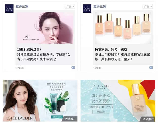 1、策略建议 1.多次复投沉淀品牌资产,再营销结合不同广告组合,提升触达精准度与效果,并丰富触达场景。 2.利用好沉浸式低噪音的广告环境讲故事,配合特殊时间节点和话题,与用户深度沟通引发共鸣,引发互动。 2、雅诗兰黛 多次复投强化品牌印象,提升用户黏性 雅诗兰黛在2017年复投超过18次,使用不同资源位组合扩大品牌曝光,再营销不断完善精准定向,优化转化成本,客资成本降低60%。 雅诗兰黛朋友圈广告&公众号广告示意