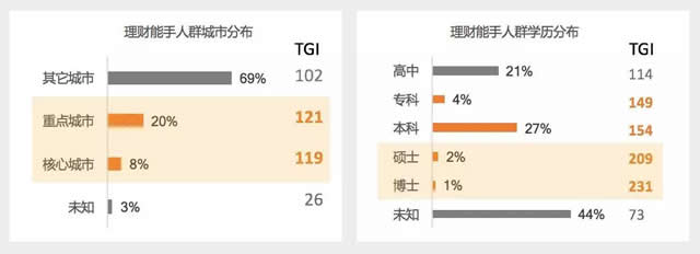 其中,更多集中在核心城市(北京、上海、广州)和重点城市(深圳、程度、武汉、大连、沈阳、天津、杭州、宁波、南京、重庆、长沙、无锡、青岛和苏州等)。 除本科学历占比高之外,该人群和大部分同龄人相比,高学历人士(硕士、博士)比例更为突出。