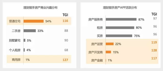 房产是家庭刚需,也是投资方式。从房产兴趣来看,理财能手人群在“普通住宅”和“商用房”上的兴趣占比要明显高于大盘,同时,他们对“房产金融”以及房产投资的相关信息更加关注。