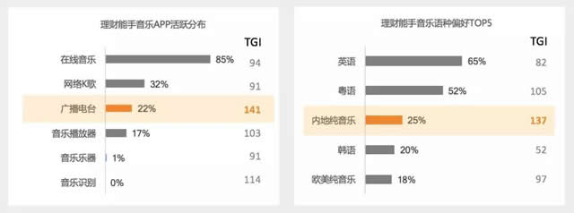 行为兴趣特征 1.习惯于电台听歌,偏爱纯音乐 理财能手人群除了在线听歌外,在“广播电台”APP的使用上也明显高于大盘。在互联网时代,他们依旧保留着电台听歌的习惯。 在音乐类型的偏好上,理财能手们更偏爱纯音乐,尤其在“内地纯音乐”的偏好占比上明显高于大盘。